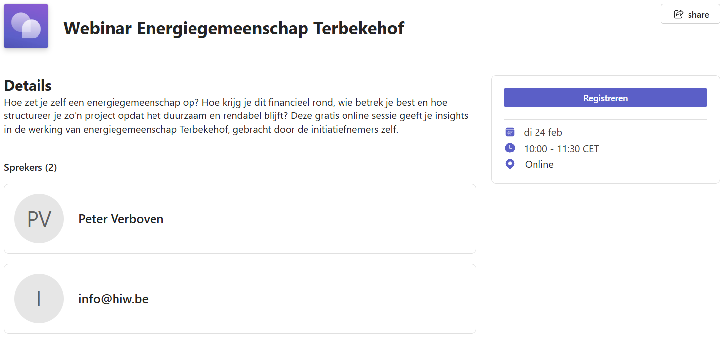 Daarna duiken we de praktijk in met de case Terbekehof, toegelicht door Martine De Brucker (Handel en Industrie Werkt – Wilrijk). Zij neemt je mee achter de schermen: hoe werd de energiegemeenschap opgezet, wie was betrokken, hoe werkt het platform erachter, welk financieel model ligt eraan ten grondslag – en vooral: is het rendabel, wat zijn de valkuilen en welke parameters bepalen het succes?
